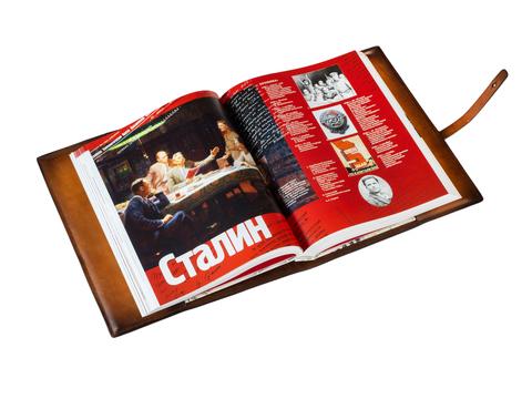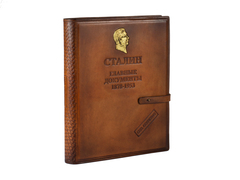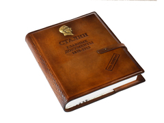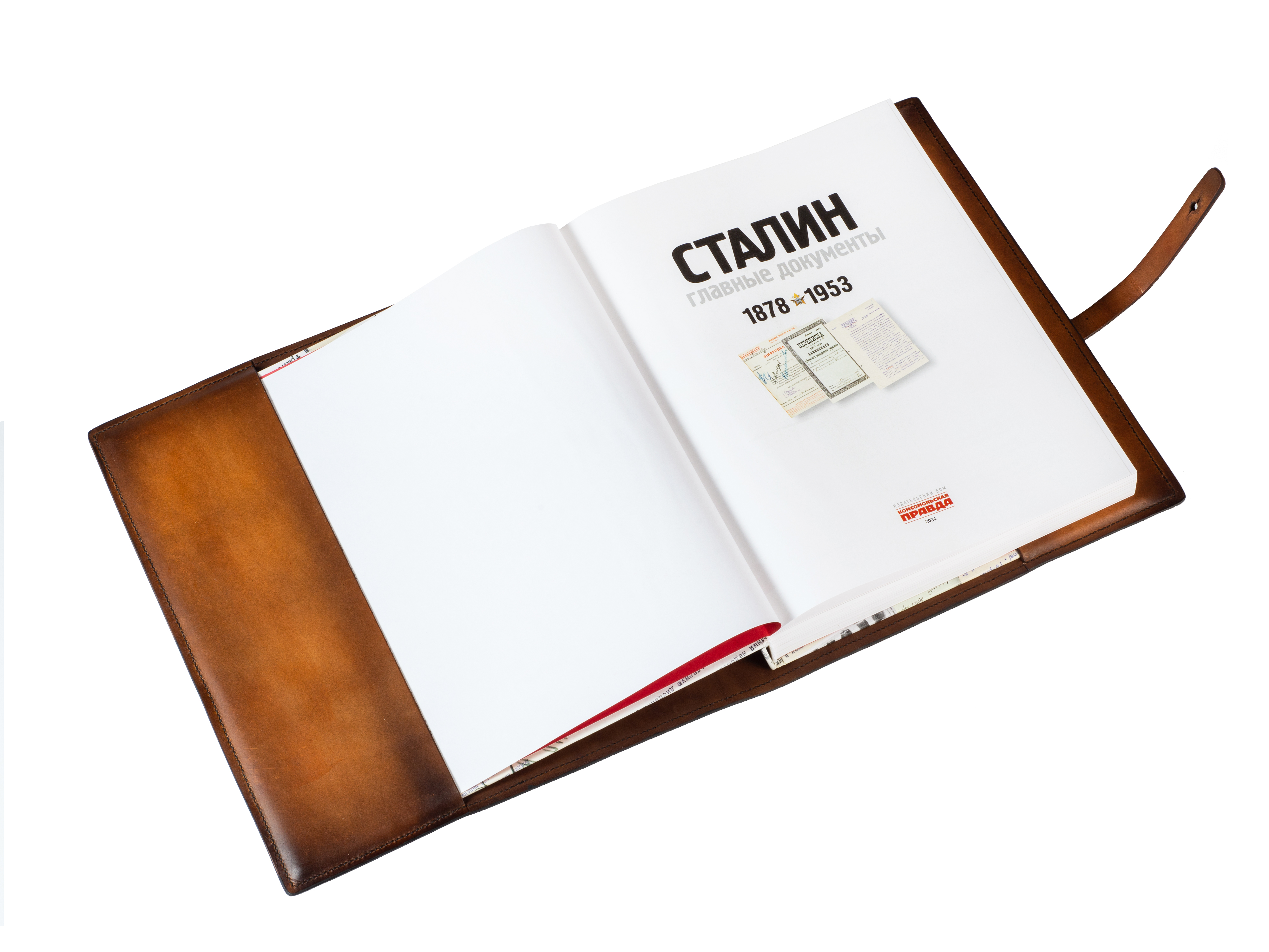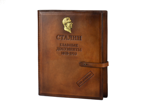 Материалы: кожа растительного дубления, художественное тиснение, фурнитура под бронзу, элементы гальванопластики, прокрашенный обрез, латунные детали, литьевой пластиковый декоративный элемент с бронзовым покрытием (бюст И. В. Сталина)